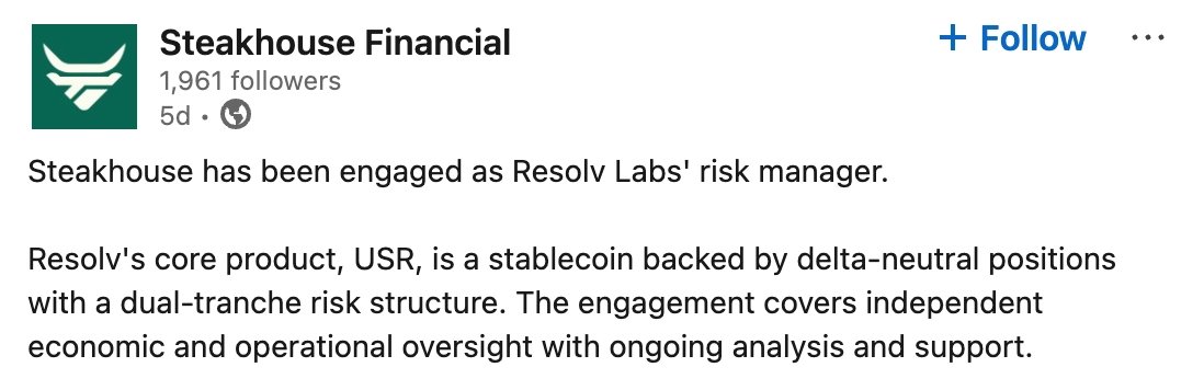 Notably, Steakhouse, despite being Resolv’s risk manager, had no exposure to the protocol.