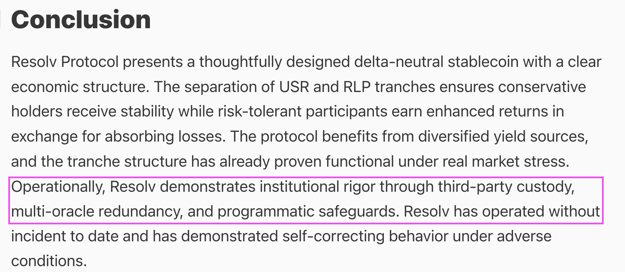 Steakhouse concluded that Resolv “demonstrates institutional rigor”, is "designed to handle these crises via automated mechanisms," and relies on "time-tested components for token minting and redemption logic."
