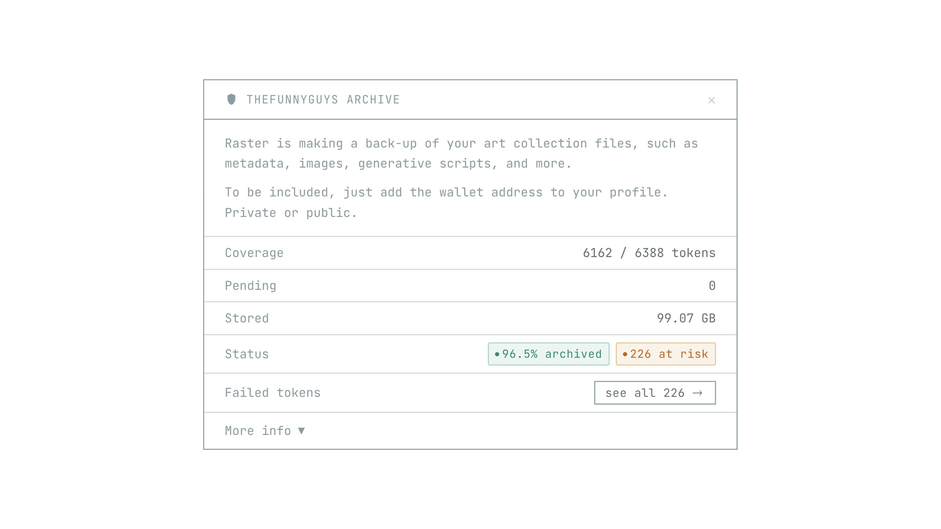 Create an account, add all your wallet addresses (no signatures needed!) and we'll back-up the files behind your artworks.